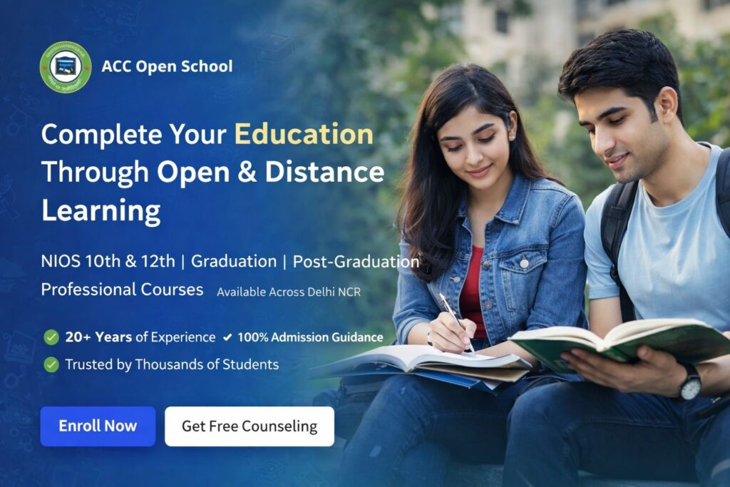 ACC Open School is one of the most trusted education support centers in Delhi NCR with over 20 years of experience in open schooling and distance learning programs. We provide complete admission assistance for NIOS 10th & 12th, graduation, post-graduation, and professional courses. From course selection to exam guidance, our team supports students at every step. With personalized counseling, flexible learning options, and a strong focus on student success, we help you complete your education smoothly and confidently.
