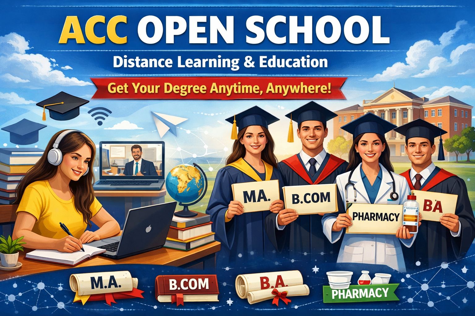 Complete your Graduation, Post-Graduation, and Professional Courses through open and distance learning mode with ACC Open School. We provide full admission assistance for BA, MA, B.Com, M.Com, BBA, MBA, B.Ed, LLB, and many more programs. With expert guidance, flexible study options, and complete support, you can achieve your academic goals without attending regular college.